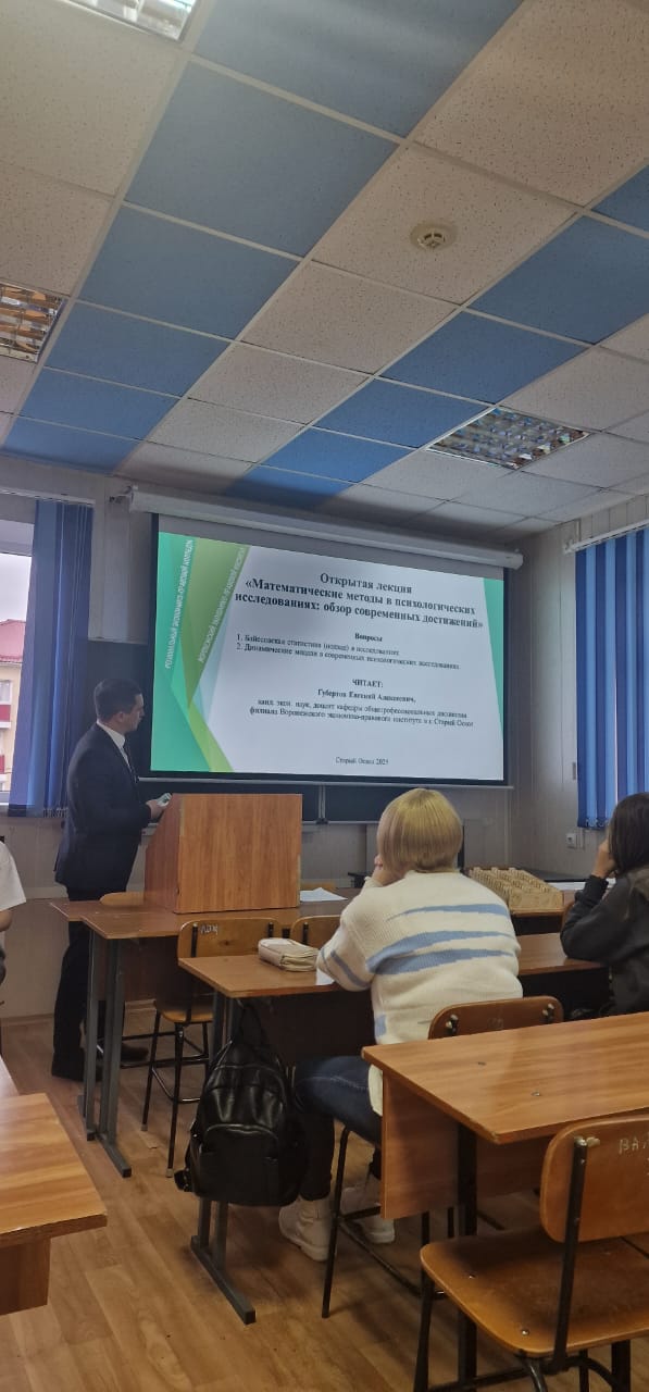 24 ноября 2025 г. в рамках плана научных мероприятий кафедры общепрофессиональных дисциплин филиала АНОО ВО «ВЭПИ» в г. Старый Оскол была организована и проведена открытая лекция на тему: «Математические методы в психологических исследованиях: обзор современных достижений». Лекцию читал канд. экон. наук, доцент Губертов Евгений Алексеевич.